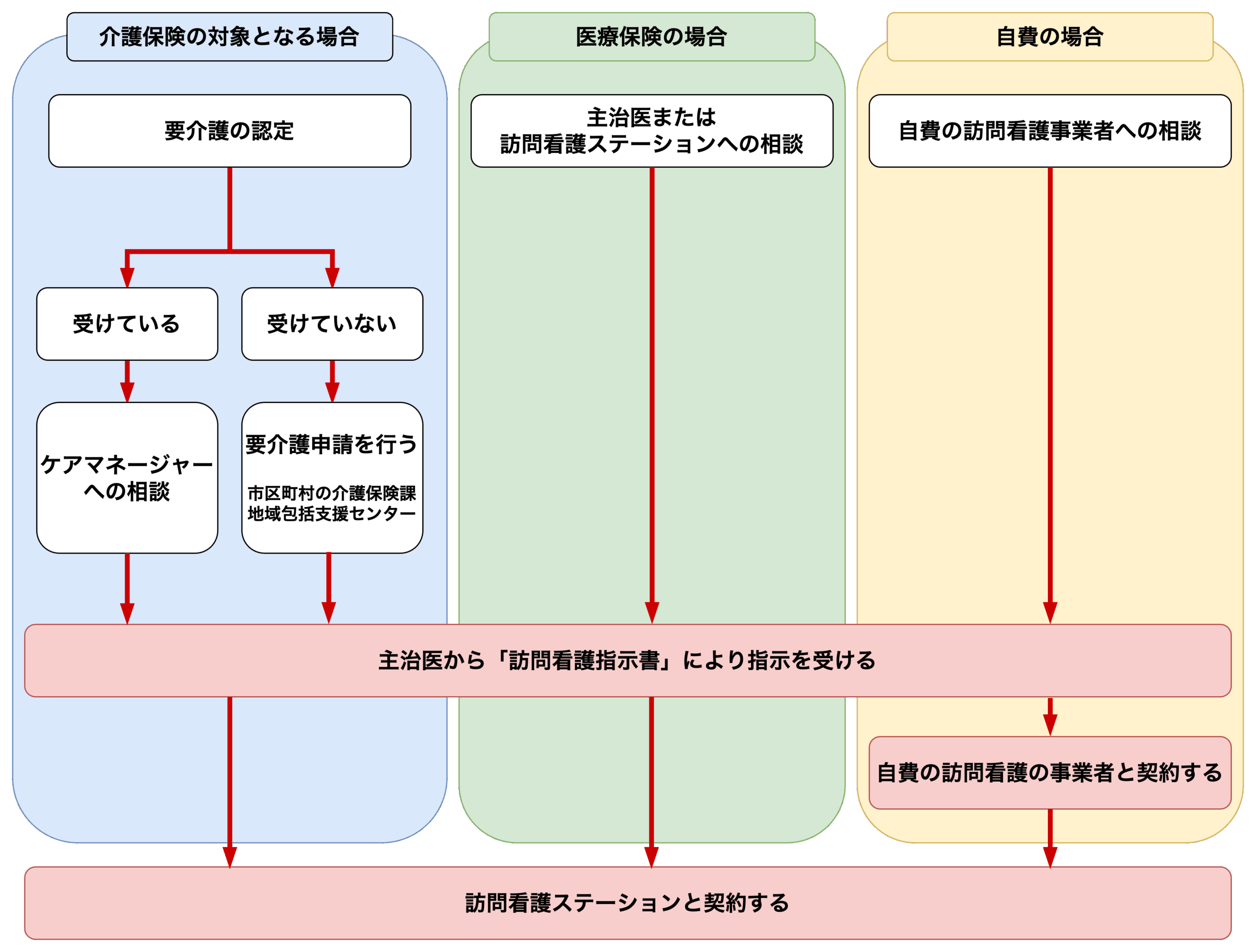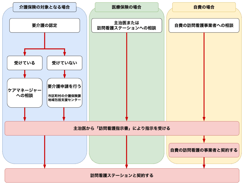 医療保険を使える方や自費の訪問看護を利用する場合は、まず最初に主治医や、訪問看護ステーションへご相談下さい。